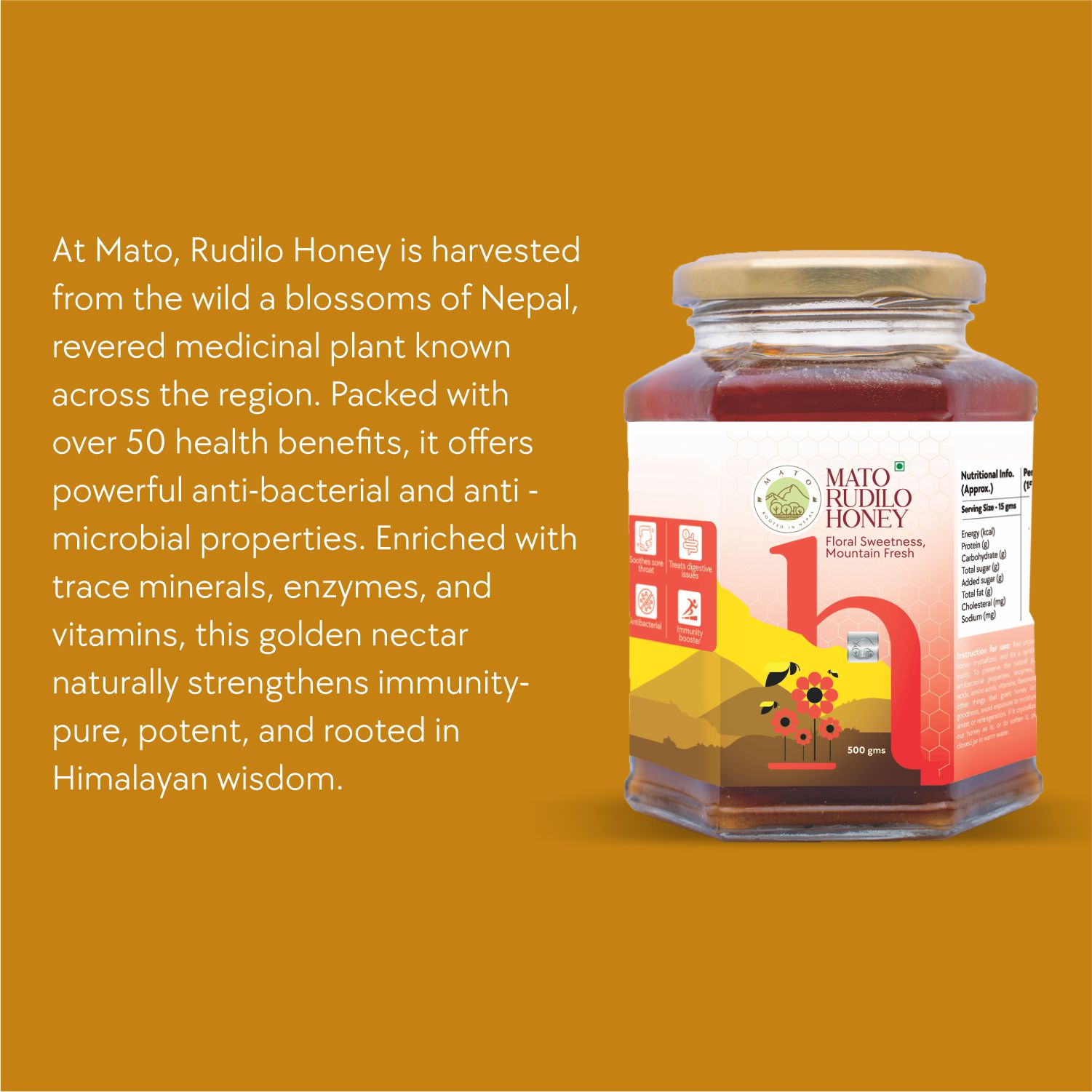 At Mato, Rudilo Honey is harvested from the wild blossoms of Nepal, a revered medicinal plant known across the region. Packed with over 50 health benefits, it offers powerful anti-bacterial and anti-microbial properties. Enriched with trace minerals, enzymes, and vitamins, this golden nectar naturally strengthens immunity—pure, potent, and rooted in Himalayan wisdom.